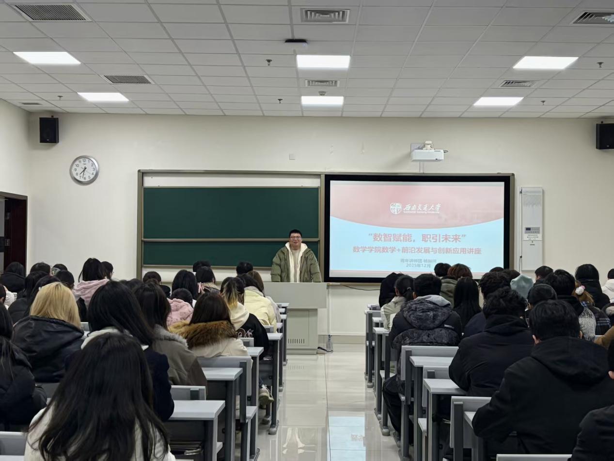 为帮助2023级学生明晰数智时代下数学专业的发展前景,科学规划学业与职业路径,12月25日,数学学院青年讲师团成员杨赫祎面向学院2023级全体学生,开展“数智赋能,职引未来——数学学院数学+前沿发展与创新应用”专题讲座。讲座聚焦保研、考研、考公、就业四大核心方向,结合学科特色与行业趋势提供精准指导,为学生成长赋能。
