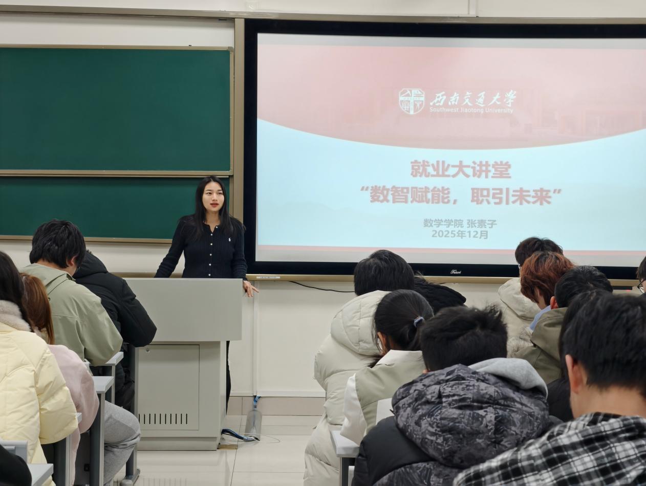 为帮助数学、大数据、统计专业本科生把握数智时代就业机遇、明晰职业方向,12月1日晚,西南交通大学数学学院“数智赋能,职引未来”就业大讲堂在X30610顺利举办。数学学院团委书记张素子主讲,为百余名数学学子带来专业实用的就业指导。